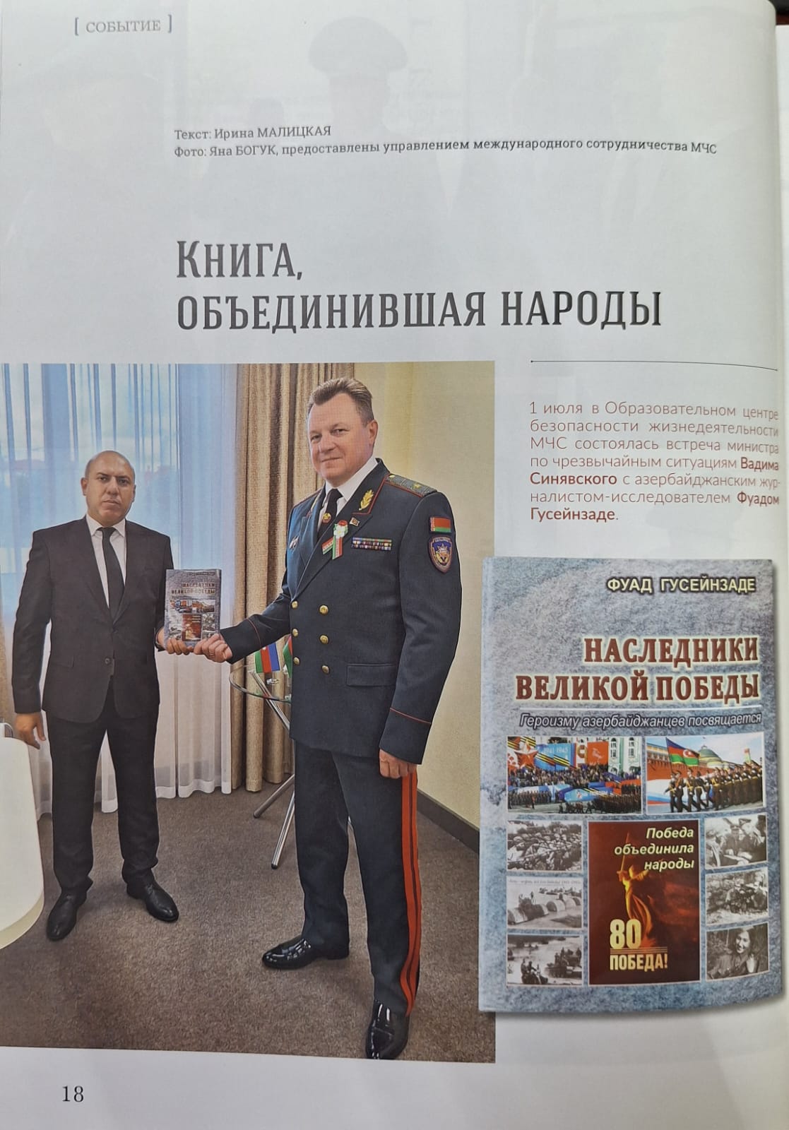 Diaspornews.az xəbər verir ki, bu görüşlə bağlı Belarusun Fövqəladə Hallar Nazirliyinin “Xilasetmə xidməti” («Служба спасения») jurnalının növbəti sayında “Xalqları birləşdirən kitab” başlığı ilə xəbər dərc olunub. Yazıda kitabın əhəmiyyəti və görüşün məqsədi haqqında məlumat verilib: “Müəllif 80 il əvvəl Belarus torpaqlarının azad edilməsi zamanı azərbaycanlı oğulların göstərdiyi qəhrəmanlıqdan danışıb. O qeyd edib ki, bu insanların nəslinin nümayəndələri bu gün Belarusdakı Azərbaycan diasporunu təmsil edirlər. Vadim Sinyavski yazıçıya səmimi təşəkkürünü bildirərək vurğulayıb ki, bu kimi layihələr tarixi yaddaşın qorunmasına və onun gənc nəslə ötürülməsinə kömək edir”.