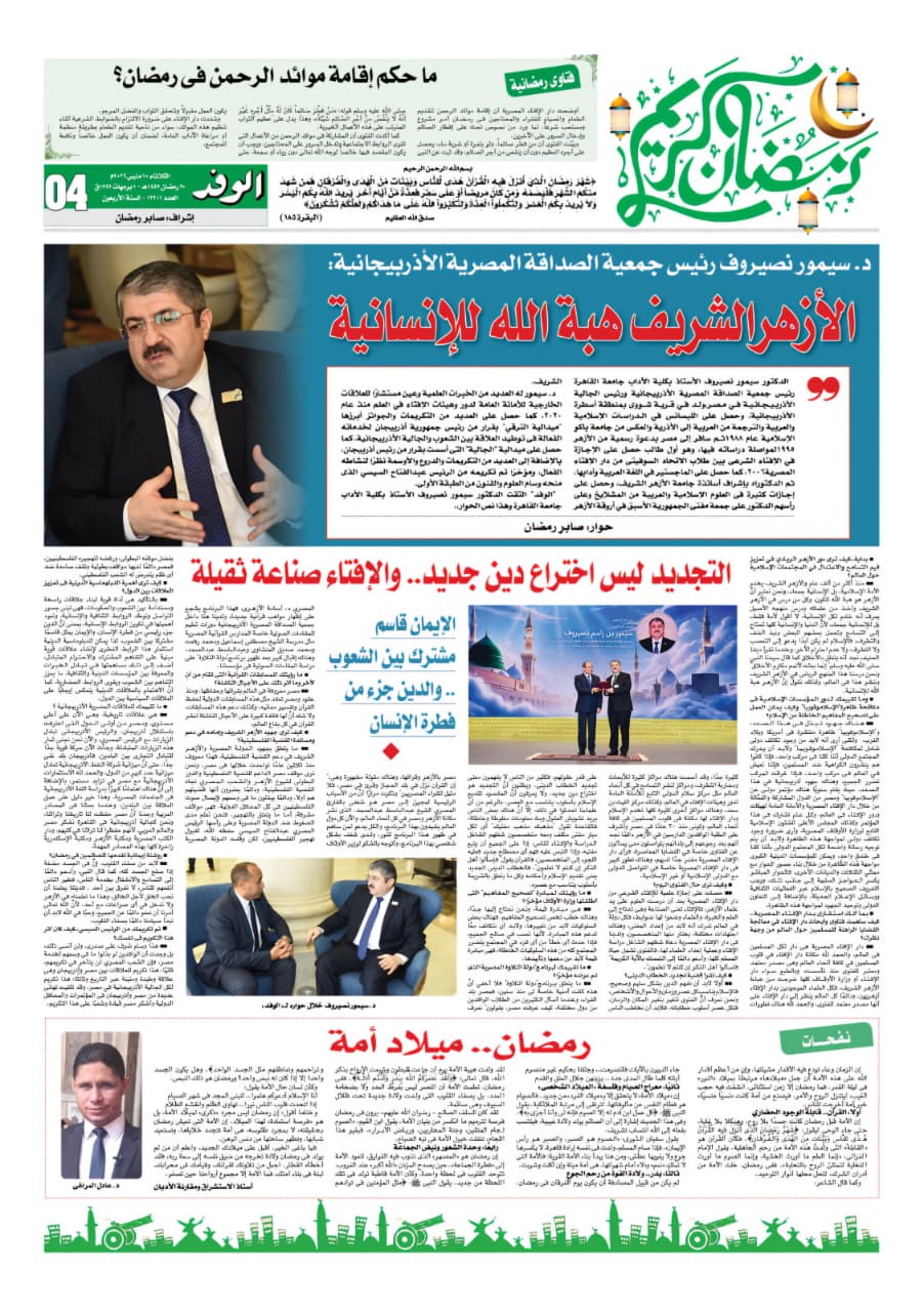 Misirin nüfuzlu “əl‑Vafd” qəzetində Misir‑Azərbaycan Dostluq Cəmiyyətinin və bu ölkədə fəaliyyət göstərən Azərbaycan diasporunun sədri, tədqiqatçı-alim Seymur Nəsirovun geniş müsahibəsi dərc olunub.
