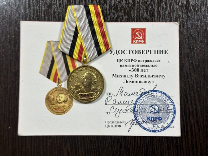 Tatarıstan Respublikası Leninoqorsk bələdiyyə rayonunun Şura deputatı, Leninoqorsk şəhəri və Leninoqorsk rayonu üzrə “Birlik” Azərbaycan milli-mədəni muxtariyyətinin sədri, AzerRos Milli Mədəni Muxtariyyət Şurasının üzvü və fəal ictimai-siyasi xadim Ramiz Mustafa oğlu Məmmədova “Mixail Vasilyeviç Lomonosovun 300 illiyi” xatirə medalı təqdim edilib.